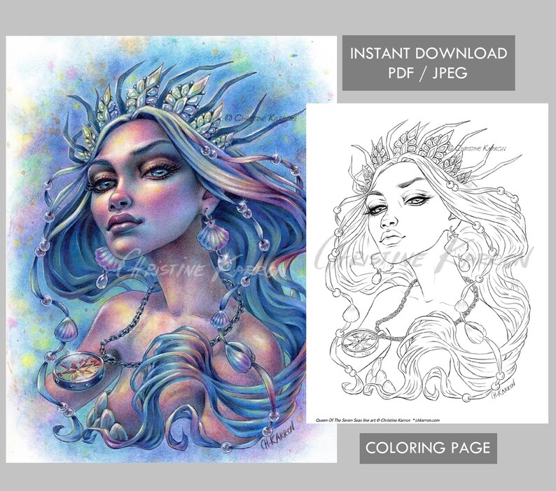 Queen of the Seven Seas Mermaid Coloring Page Grayscale | Etsy If sharing colored image online please credit the artist - Christine Karron #christinekarron #chkarron Please DO NOT share or post the uncolored versions of the files in any digital form, on Message In The Bottle Mermaid Coloring Page Grayscale Instant Download Printable File (JPEG and PDF).
