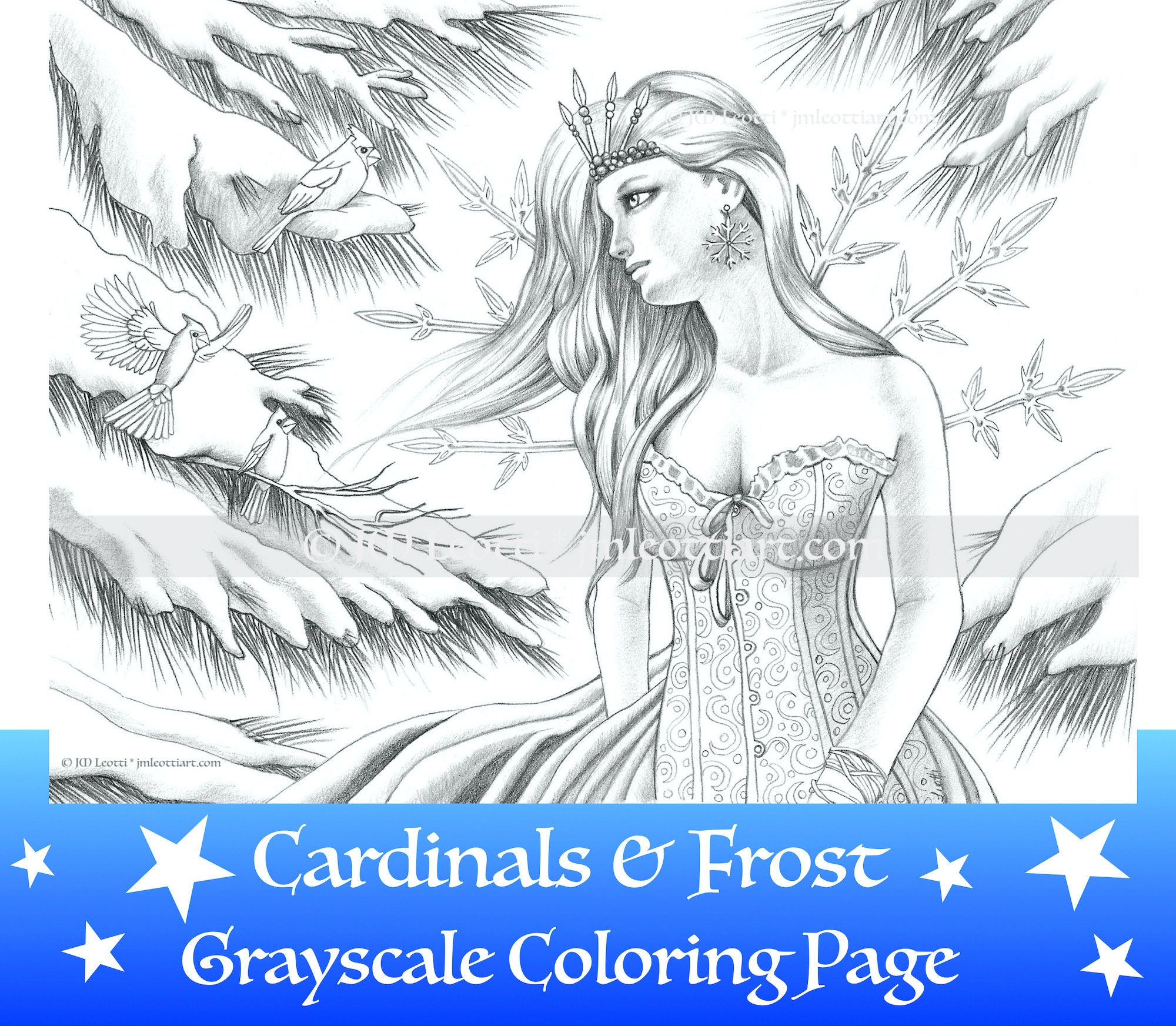 Cardinals & Frost Adult Coloring Page Instant Download Winter Snow Fairy Grayscale Coloring Pages Goddess Faerie Art