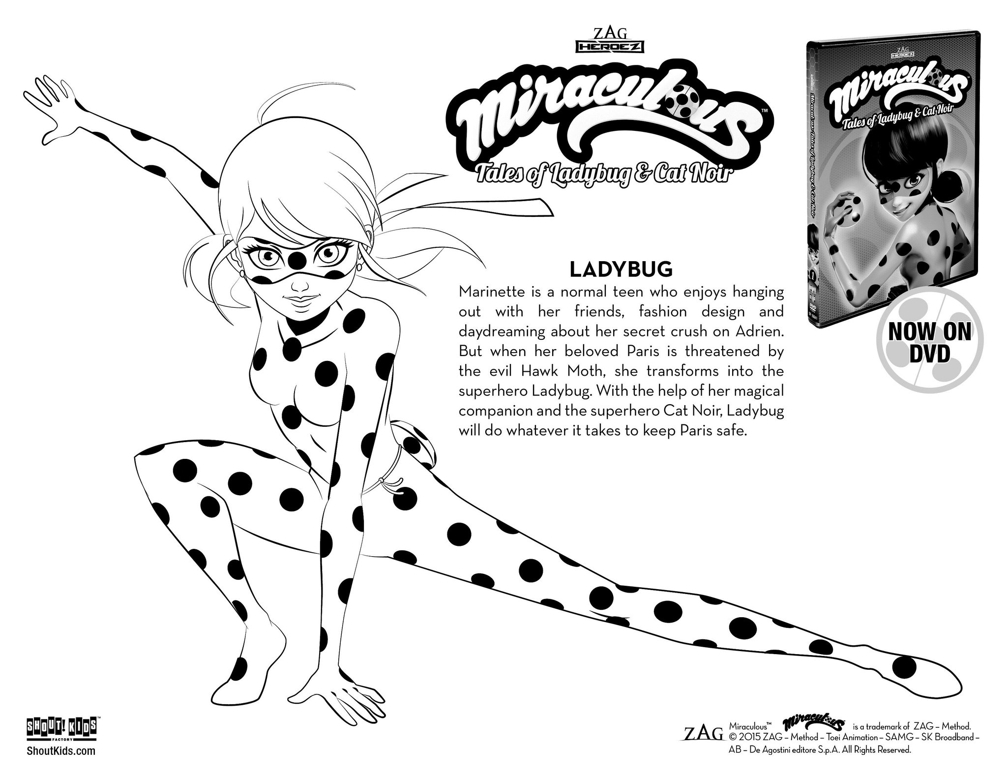 Miraculous / LadyBug - Free printable Coloring pages for kids Miraculous / LadyBug. Coloring Pages for Kids. In modern-day Paris, teenagers Marinette Dupain-Cheng and Adrien Agreste transform into superheroes when evil arises. Marinette transforms into her superhero persona, Ladybug, while Adrien transforms into his superhero persona, Cat Noir, using magical jeweled objects known as the Miraculous.
